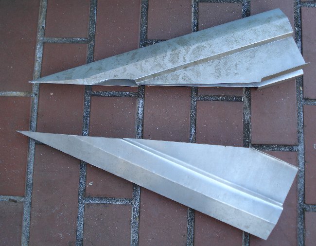 曲げ加工の工程は、裏側の「筋彫り」を深くし過ぎて しまうと、曲げた時に割れてしまうので、掘り込みは 指先の感覚だけが頼りという、かなり繊細な作業だ。 曲げるときも、ゆっくり過ぎると角が丸まってしまい 一気に曲げすぎると折れてしまいそうなので、力加減が 難しく、大胆かつ繊細に力を加えなければならない。 ベンダーがあれば簡単に加工出来るんだろうけど、全て 手作業なので、かなり大変だ。 一つのパーツで9箇所、それが二つなので、18箇所も 筋彫りと曲げの作業が続く。 そして、ついに大きな加工はこれで終了した。 力仕事でもあったけど、角が割れてしまう恐怖と戦って いたので、神経が磨り減ったよ。