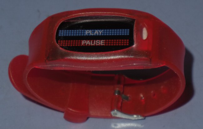 分解した腕時計のバンド部分を使って、空いた部分に 切り取ったインジケーターを嵌め込もう。 このバンドは、やや伸縮するビニールっぽい素材なので ドライヤーで暖めながら、千切れないように慎重に作業 しよう。 そして、ついに完成。 わたしの解釈としては「腕時計型の情報端末」とした。 インジケーターなどに使われている透明なプラスチック などは、傷が付きにくく見栄えが良いので、こういう 物を作るにはうってつけの素材だろう。 更に印刷されている文字や色などを使えば、なんとなく 説得力が増していくのが面白いね。