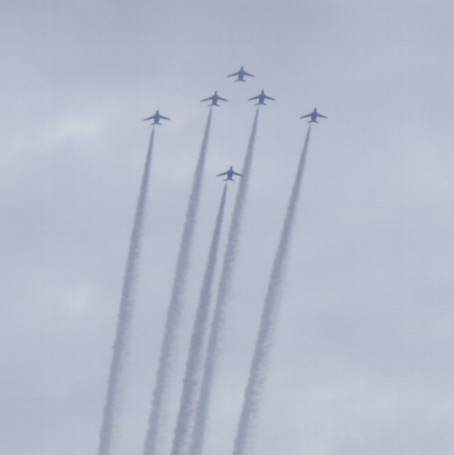 昨日14時頃、なにやら複数のジェットエンジン音が聞こ えてきたので、外を見てみると、6機編隊を確認。